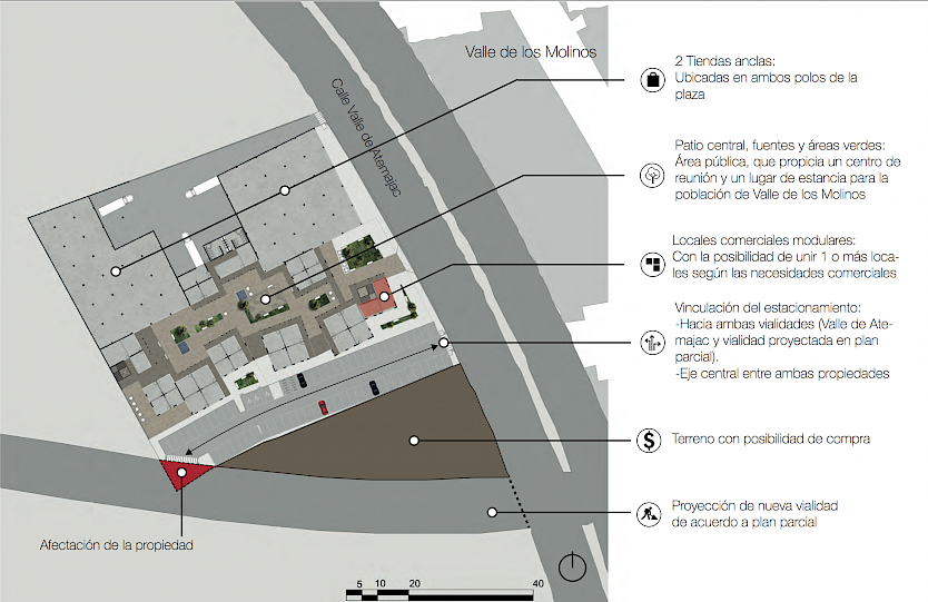 La plaza cuanta con 2 tiendas anclas, locales modulares que ofrecen la oportunidad de hacer un local más grande según la necesidad de cada comerciante, estacionamientos y terrenos a la venta, ya que según los planes parciales habrá nuevas vialidades, lo que indica que la zona seguirá creciendo.